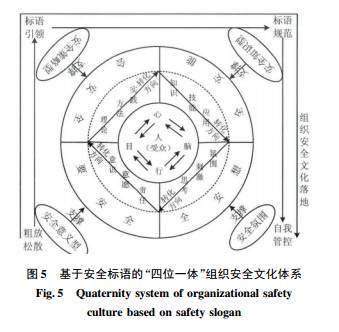 由图 5 可知,所谓“四位一体”组织安全文化体系,即“要安全、会安全、能安全、想安全”组织安全文化体系,阐明了以安全标语为载体建设组织安全文化的机理和过程,具体解释如下: